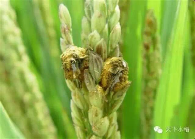2、发病特点:稻曲病是一种真菌性病害,病菌以菌核和厚垣孢子越冬,翌年春季插秧灌水时,菌核浮于水面,进而形成子座并产生子囊和子囊孢子。水稻抽穗开花时大量子囊孢子随风飞散,吹落在颖壳内腔和颖壳合缝处的子囊孢子萌发后侵入幼嫩籽粒形成病粒(即菌核),灌溉时谷粒也可受到侵害。从抽穗后至成熟期均能发病,其中孕穗期最易感病,水稻孕穗至抽穗期高温多湿,温度在26—28℃最适宜发病,病菌最易发育。长期低温、寡照、多雨可减弱水稻的抗病性,偏施氮肥,水稻抽穗后生长过于繁茂嫩绿,深水灌溉,田水落干过迟发病重。稻曲病易加重发生。